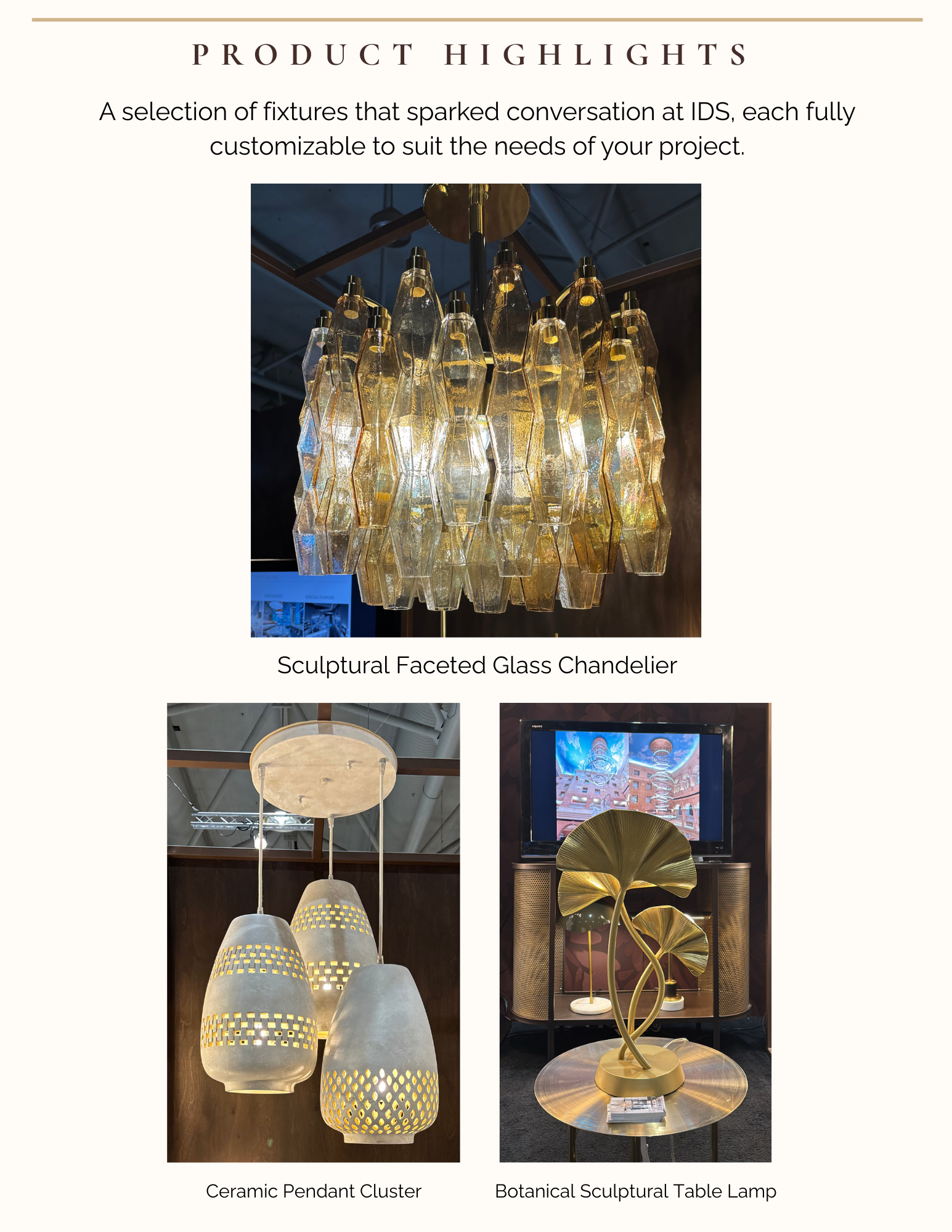 We were thrilled to showcase some of our newest custom lighting designs, featuring unique finishes and sculptural, organic forms. If we didn’t get a chance to connect in person or if you’d like to explore an idea further we’d love to hear from you!